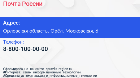 Почта России по адресу Орловская область, Орёл, Московская, 6 в дальнейшем Организация, размещена в следующих категориях: