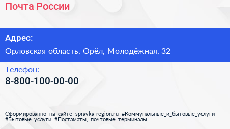 Почта России по адресу Орловская область, Орёл, Молодёжная, 32 в дальнейшем Организация, размещена в следующих категориях: