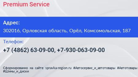 Premium Service по адресу 302016, Орловская область, Орёл, Комсомольская, 187 в дальнейшем Организация, размещена в следующих категориях: