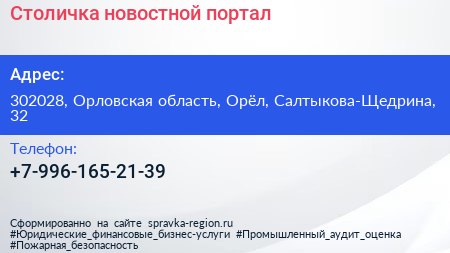 Столичка, новостной портал по адресу 302028, Орловская область, Орёл, Салтыкова-Щедрина, 32 в дальнейшем Организация, размещена в следующих категориях: