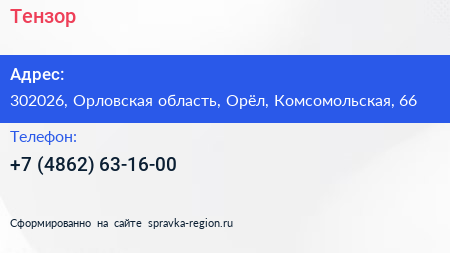 Тензор по адресу 302026, Орловская область, Орёл, Комсомольская, 66 в дальнейшем Организация, размещена в следующих категориях: