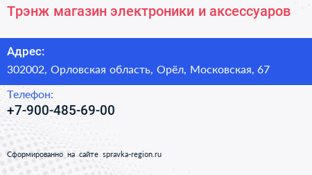 Трэнж, магазин электроники и аксессуаров по адресу 302002, Орловская область, Орёл, Московская, 67 в дальнейшем Организация, размещена в следующих категориях: