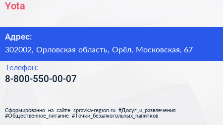 Yota по адресу 302002, Орловская область, Орёл, Московская, 67 в дальнейшем Организация, размещена в следующих категориях: