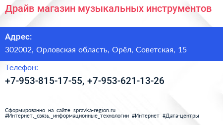 Драйв, магазин музыкальных инструментов по адресу 302002, Орловская область, Орёл, Советская, 15 в дальнейшем Организация, размещена в следующих категориях: