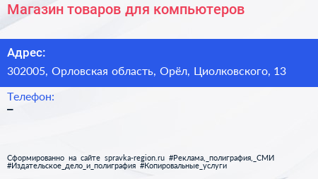 Магазин товаров для компьютеров по адресу 302005, Орловская область, Орёл, Циолковского, 13 в дальнейшем Организация, размещена в следующих категориях: