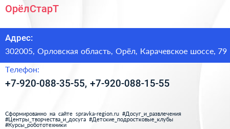 ОрёлСтарТ по адресу 302005, Орловская область, Орёл, Карачевское шоссе, 79 в дальнейшем Организация, размещена в следующих категориях: