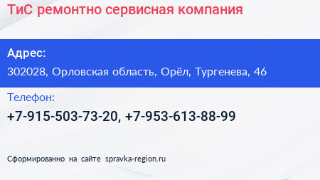 ТиС, ремонтно-сервисная компания по адресу 302028, Орловская область, Орёл, Тургенева, 46 в дальнейшем Организация, размещена в следующих категориях: