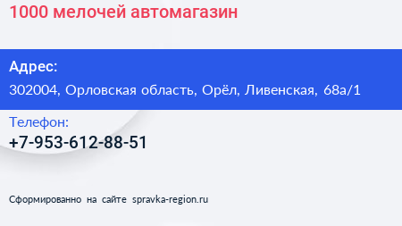 1000 мелочей, автомагазин по адресу 302004, Орловская область, Орёл, Ливенская, 68а/1 в дальнейшем Организация, размещена в следующих категориях: