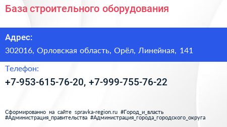 База строительного оборудования по адресу 302016, Орловская область, Орёл, Линейная, 141 в дальнейшем Организация, размещена в следующих категориях: