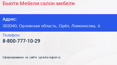 Бьюти Мебели, салон мебели по адресу 302040, Орловская область, Орёл, Ломоносова, 6 в дальнейшем Организация, размещена в следующих категориях: