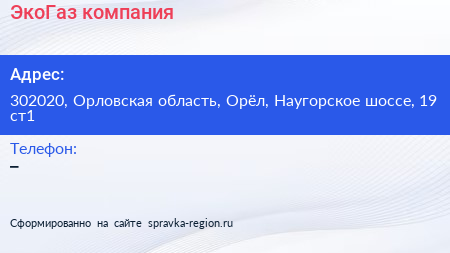 ЭкоГаз, компания по адресу 302020, Орловская область, Орёл, Наугорское шоссе, 19 ст1 в дальнейшем Организация, размещена в следующих категориях: