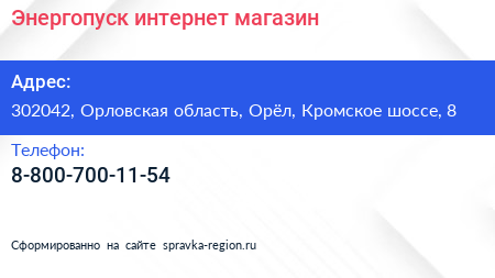 Энергопуск, интернет-магазин по адресу 302042, Орловская область, Орёл, Кромское шоссе, 8 в дальнейшем Организация, размещена в следующих категориях: