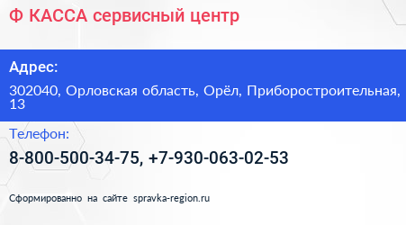 Ф-КАССА, сервисный центр по адресу 302040, Орловская область, Орёл, Приборостроительная, 13 в дальнейшем Организация, размещена в следующих категориях:
