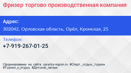 Фризер, торгово-производственная компания по адресу 302042, Орловская область, Орёл, Кромская, 25 в дальнейшем Организация, размещена в следующих категориях: