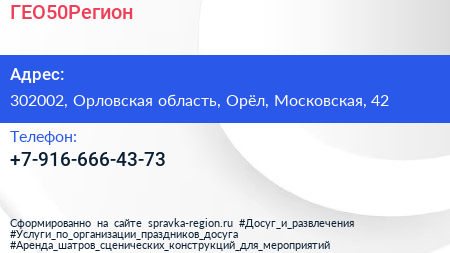 ГЕО50Регион по адресу 302002, Орловская область, Орёл, Московская, 42 в дальнейшем Организация, размещена в следующих категориях: