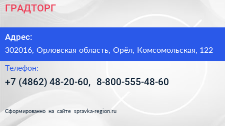 ГРАДТОРГ по адресу 302016, Орловская область, Орёл, Комсомольская, 122 в дальнейшем Организация, размещена в следующих категориях: