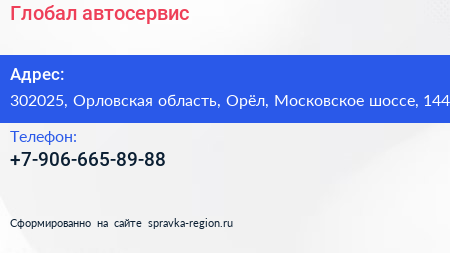 Глобал, автосервис по адресу 302025, Орловская область, Орёл, Московское шоссе, 144 в дальнейшем Организация, размещена в следующих категориях: