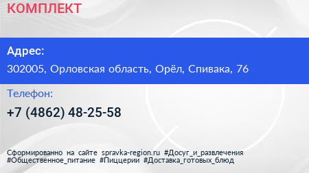 КОМПЛЕКТ по адресу 302005, Орловская область, Орёл, Спивака, 76 в дальнейшем Организация, размещена в следующих категориях: