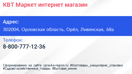 КВТ Маркет, интернет-магазин по адресу 302004, Орловская область, Орёл, Ливенская, 68а в дальнейшем Организация, размещена в следующих категориях:
