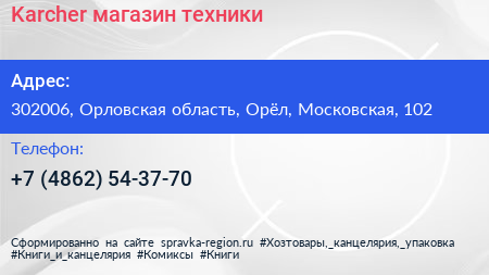 Karcher, магазин техники по адресу 302006, Орловская область, Орёл, Московская, 102 в дальнейшем Организация, размещена в следующих категориях:
