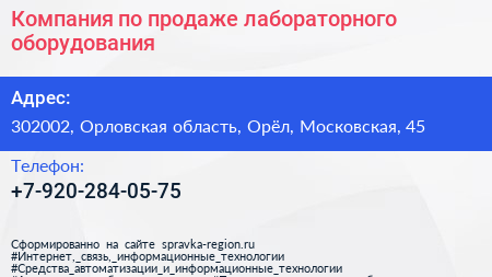 Компания по продаже лабораторного оборудования по адресу 302002, Орловская область, Орёл, Московская, 45 в дальнейшем Организация, размещена в следующих категориях: