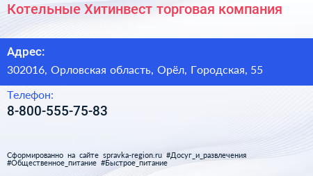 Котельные-Хитинвест, торговая компания по адресу 302016, Орловская область, Орёл, Городская, 55 в дальнейшем Организация, размещена в следующих категориях: