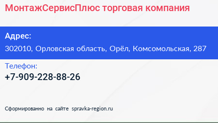 МонтажСервисПлюс, торговая компания по адресу 302010, Орловская область, Орёл, Комсомольская, 287 в дальнейшем Организация, размещена в следующих категориях: