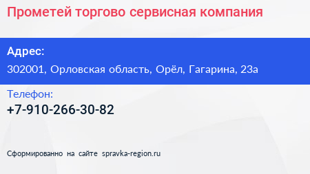 Прометей, торгово-сервисная компания по адресу 302001, Орловская область, Орёл, Гагарина, 23а в дальнейшем Организация, размещена в следующих категориях: