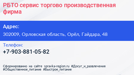 РБТО-сервис, торгово-производственная фирма по адресу 302009, Орловская область, Орёл, Гайдара, 48 в дальнейшем Организация, размещена в следующих категориях:
