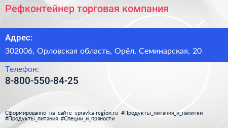 Рефконтейнер, торговая компания по адресу 302006, Орловская область, Орёл, Семинарская, 20 в дальнейшем Организация, размещена в следующих категориях: