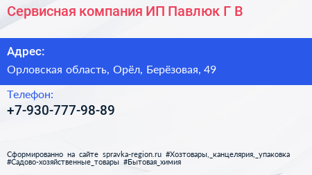 Сервисная компания, ИП Павлюк Г.В. по адресу Орловская область, Орёл, Берёзовая, 49 в дальнейшем Организация, размещена в следующих категориях: