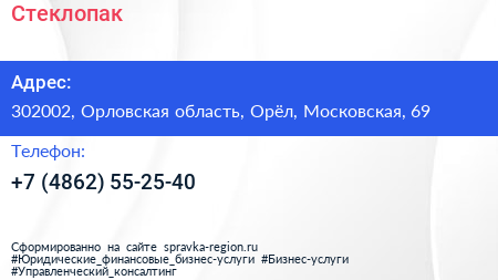 Стеклопак по адресу 302002, Орловская область, Орёл, Московская, 69 в дальнейшем Организация, размещена в следующих категориях:
