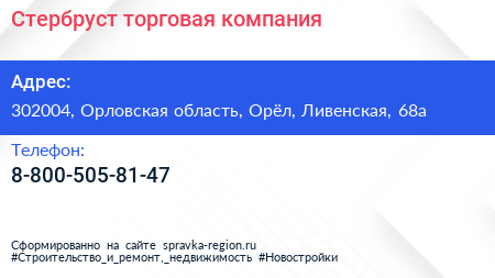Стербруст, торговая компания по адресу 302004, Орловская область, Орёл, Ливенская, 68а в дальнейшем Организация, размещена в следующих категориях: