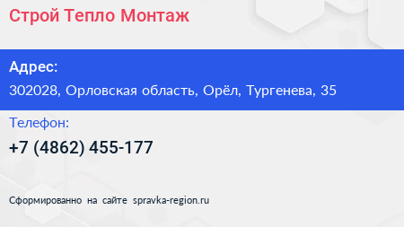 Строй-Тепло-Монтаж по адресу 302028, Орловская область, Орёл, Тургенева, 35 в дальнейшем Организация, размещена в следующих категориях: