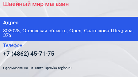 Швейный мир, магазин по адресу 302028, Орловская область, Орёл, Салтыкова-Щедрина, 37а в дальнейшем Организация, размещена в следующих категориях: