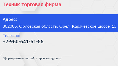 Техник, торговая фирма по адресу 302005, Орловская область, Орёл, Карачевское шоссе, 15 в дальнейшем Организация, размещена в следующих категориях: