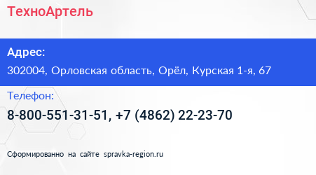 ТехноАртель по адресу 302004, Орловская область, Орёл, Курская 1-я, 67 в дальнейшем Организация, размещена в следующих категориях: