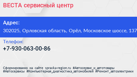 ВЕСТА, сервисный центр по адресу 302025, Орловская область, Орёл, Московское шоссе, 137 в дальнейшем Организация, размещена в следующих категориях: