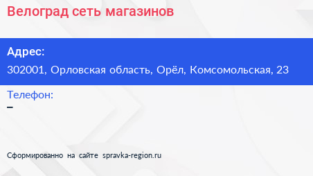 Велоград, сеть магазинов по адресу 302001, Орловская область, Орёл, Комсомольская, 23 в дальнейшем Организация, размещена в следующих категориях: