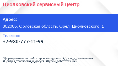Циолковский, сервисный центр по адресу 302005, Орловская область, Орёл, Циолковского, 1 в дальнейшем Организация, размещена в следующих категориях: