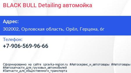 BLACK BULL Detailing, автомойка по адресу 302002, Орловская область, Орёл, Герцена, 6г в дальнейшем Организация, размещена в следующих категориях: