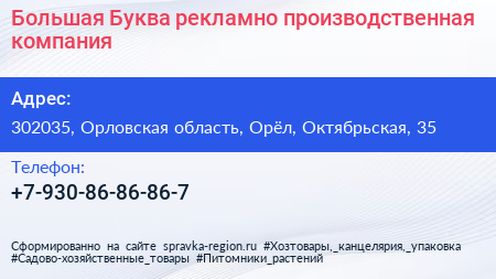 Большая Буква, рекламно-производственная компания по адресу 302035, Орловская область, Орёл, Октябрьская, 35 в дальнейшем Организация, размещена в следующих категориях: