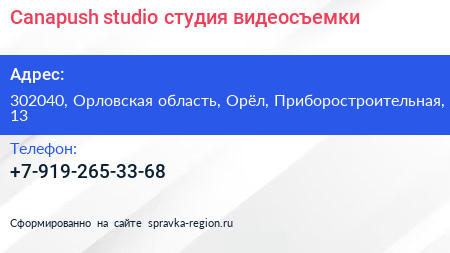 Canapush studio, студия видеосъемки по адресу 302040, Орловская область, Орёл, Приборостроительная, 13 в дальнейшем Организация, размещена в следующих категориях: