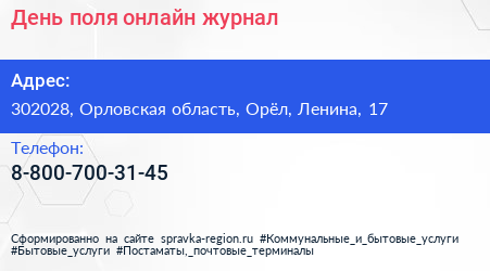 День поля, онлайн-журнал по адресу 302028, Орловская область, Орёл, Ленина, 17 в дальнейшем Организация, размещена в следующих категориях:
