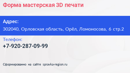 Форма, мастерская 3D-печати по адресу 302040, Орловская область, Орёл, Ломоносова, 6 стр.2 в дальнейшем Организация, размещена в следующих категориях: