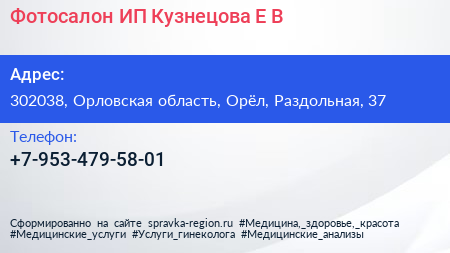 Фотосалон, ИП Кузнецова Е.В. по адресу 302038, Орловская область, Орёл, Раздольная, 37 в дальнейшем Организация, размещена в следующих категориях: