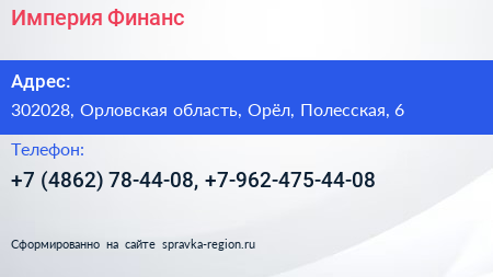 Империя-Финанс по адресу 302028, Орловская область, Орёл, Полесская, 6 в дальнейшем Организация, размещена в следующих категориях:
