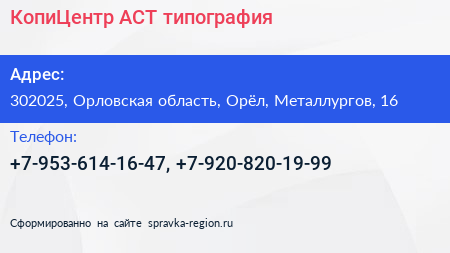 КопиЦентр АСТ, типография по адресу 302025, Орловская область, Орёл, Металлургов, 16 в дальнейшем Организация, размещена в следующих категориях: