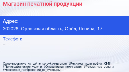 Магазин печатной продукции по адресу 302028, Орловская область, Орёл, Ленина, 17 в дальнейшем Организация, размещена в следующих категориях: