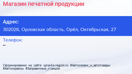 Магазин печатной продукции по адресу 302028, Орловская область, Орёл, Октябрьская, 27 в дальнейшем Организация, размещена в следующих категориях: